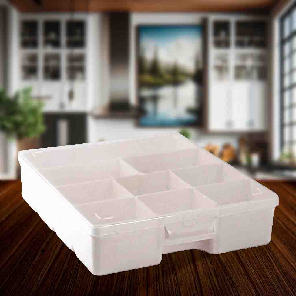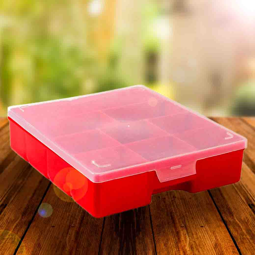 Uma solução prática para organizar uma variedade de itens, desde parafusos e pequenas peças eletrônicas até linhas de costura, aviamentos, agulhas, bijuteria e acessórios. Com nove compartimentos separados, esta caixa oferece uma maneira eficiente de manter seus itens essenciais ordenados e acessíveis.